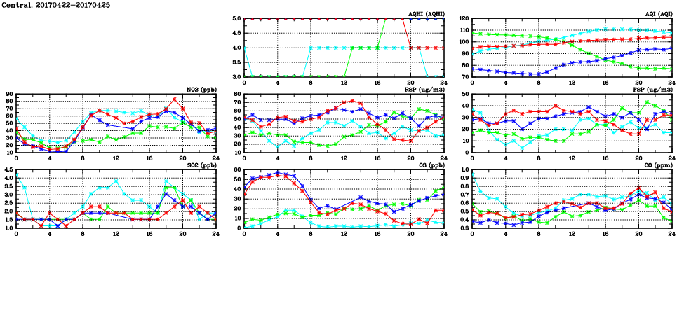 | Air Quality Data Time Series in Central (2017/04/25) | ( Line colors: Day -3 Day -2 Day -1 Current day ) | 2D Map Current AQHI |