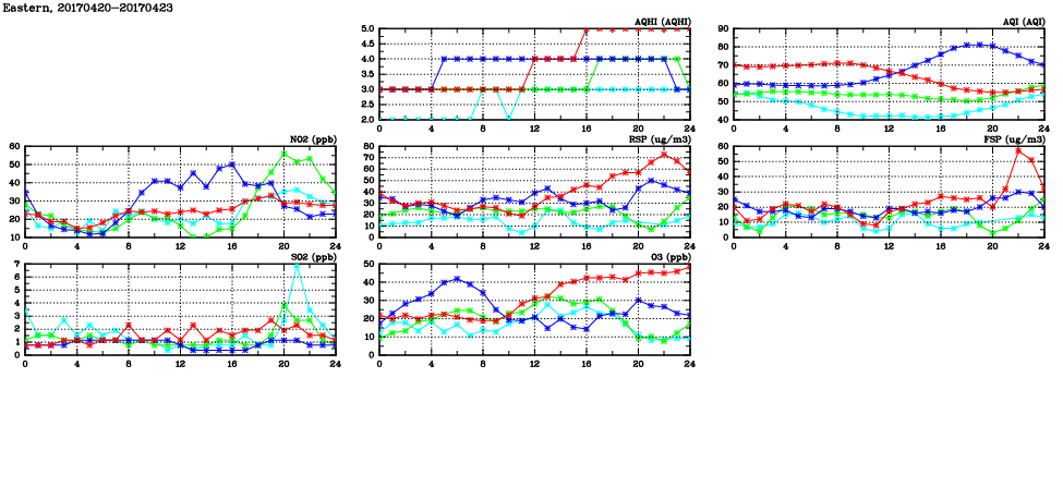 | Air Quality Data Time Series in Eastern (2017/04/23) | ( Line colors: Day -3 Day -2 Day -1 Current day ) | 2D Map Current AQHI |
