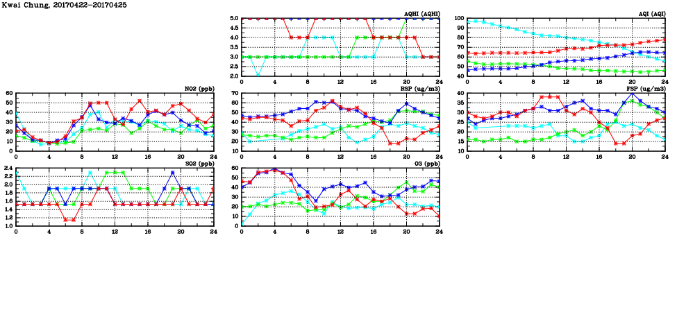 | Air Quality Data Time Series in Kwai Chung (2017/04/25) | ( Line colors: Day -3 Day -2 Day -1 Current day ) | 2D Map Current AQHI |
