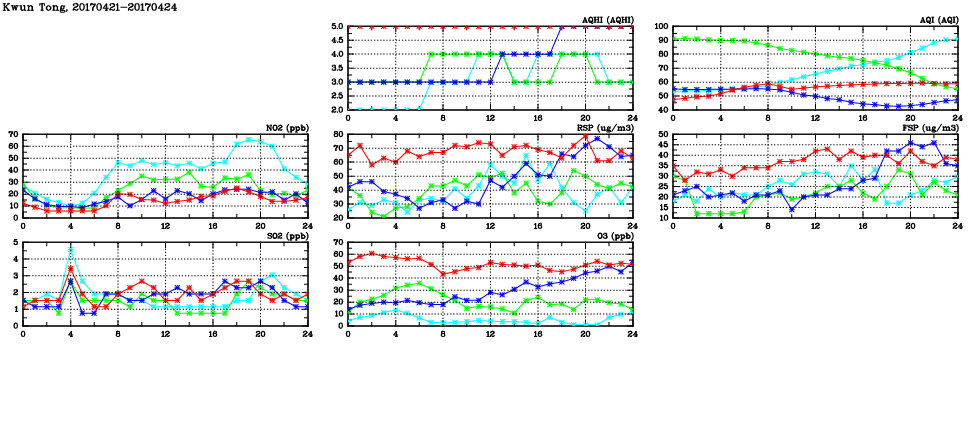 | Air Quality Data Time Series in Kwun Tong (2017/04/24) | ( Line colors: Day -3 Day -2 Day -1 Current day ) | 2D Map Current AQHI |