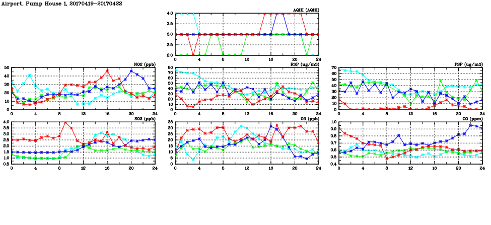 | Air Quality Data Time Series in Airport, Pump House 1 (2017/04/22) | ( Line colors: Day -3 Day -2 Day -1 Current day ) | 2D Map Current AQHI |