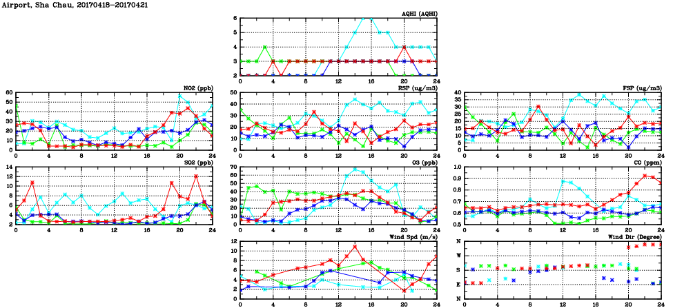 | Air Quality Data Time Series in Airport, Sha Chau (2017/04/21) | ( Line colors: Day -3 Day -2 Day -1 Current day ) | 2D Map Current AQHI |