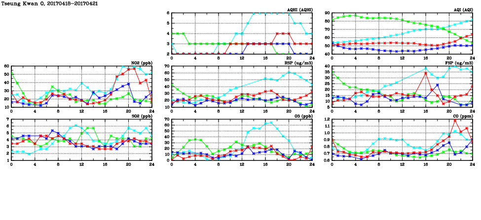 | Air Quality Data Time Series in Tseung Kwan O (2017/04/21) | ( Line colors: Day -3 Day -2 Day -1 Current day ) | 2D Map Current AQHI |