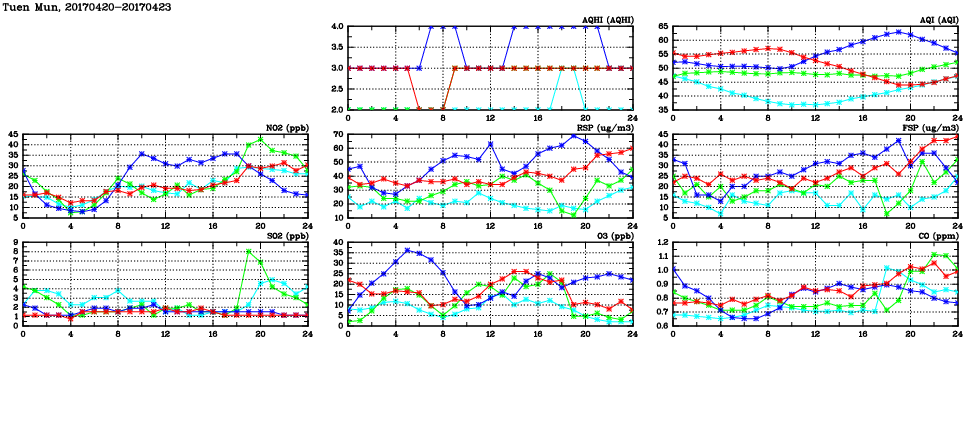 | Air Quality Data Time Series in Tuen Mun (2017/04/23) | ( Line colors: Day -3 Day -2 Day -1 Current day ) | 2D Map Current AQHI |