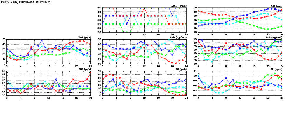 | Air Quality Data Time Series in Tuen Mun (2017/04/25) | ( Line colors: Day -3 Day -2 Day -1 Current day ) | 2D Map Current AQHI |