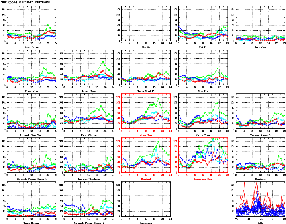 | Air Quality Data Time Series for NO2 (2017/04/20) | ( Line colors: Day -3 Day -2 Day -1 Current day ) | 2D Map Current AQHI |