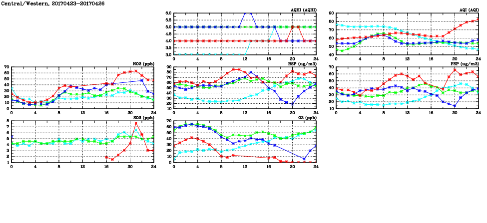 | Air Quality Data Time Series in Central/Western (2017/04/26) | ( Line colors: Day -3 Day -2 Day -1 Current day ) | 2D Map Current AQHI |