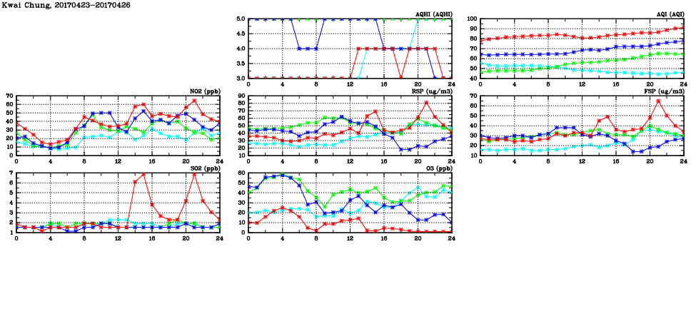 | Air Quality Data Time Series in Kwai Chung (2017/04/26) | ( Line colors: Day -3 Day -2 Day -1 Current day ) | 2D Map Current AQHI |