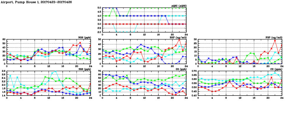 | Air Quality Data Time Series in Airport, Pump House 1 (2017/04/26) | ( Line colors: Day -3 Day -2 Day -1 Current day ) | 2D Map Current AQHI |