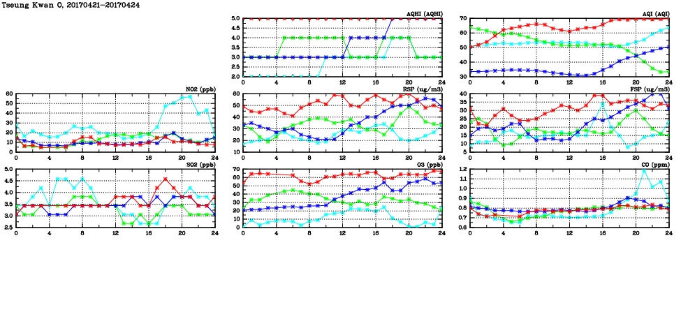 | Air Quality Data Time Series in Tseung Kwan O (2017/04/24) | ( Line colors: Day -3 Day -2 Day -1 Current day ) | 2D Map Current AQHI |
