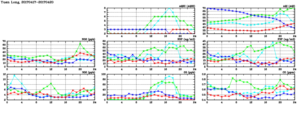 | Air Quality Data Time Series in Yuen Long (2017/04/20) | ( Line colors: Day -3 Day -2 Day -1 Current day ) | 2D Map Current AQHI |