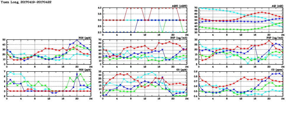 | Air Quality Data Time Series in Yuen Long (2017/04/22) | ( Line colors: Day -3 Day -2 Day -1 Current day ) | 2D Map Current AQHI |