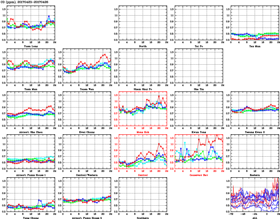 | Air Quality Data Time Series for CO (2017/04/26) | ( Line colors: Day -3 Day -2 Day -1 Current day ) | 2D Map Current AQHI |
