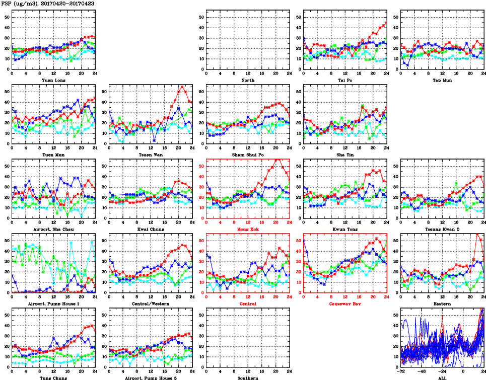| Air Quality Data Time Series for FSP (2017/04/23) | ( Line colors: Day -3 Day -2 Day -1 Current day ) | 2D Map Current AQHI |