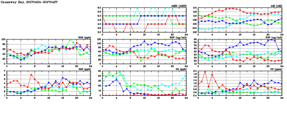 | Air Quality Data Time Series in Causeway Bay (2017/04/27) | ( Line colors: Day -3 Day -2 Day -1 Current day ) | 2D Map Current AQHI |
