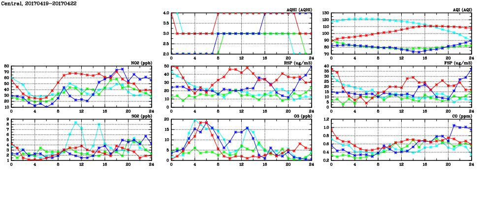 | Air Quality Data Time Series in Central (2017/04/22) | ( Line colors: Day -3 Day -2 Day -1 Current day ) | 2D Map Current AQHI |