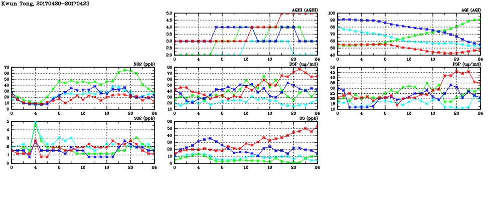 | Air Quality Data Time Series in Kwun Tong (2017/04/23) | ( Line colors: Day -3 Day -2 Day -1 Current day ) | 2D Map Current AQHI |