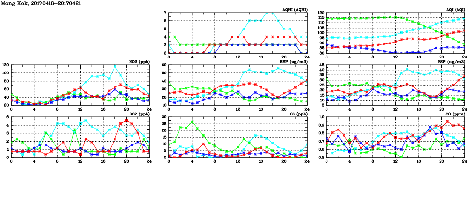 | Air Quality Data Time Series in Mong Kok (2017/04/21) | ( Line colors: Day -3 Day -2 Day -1 Current day ) | 2D Map Current AQHI |