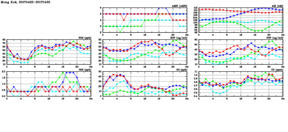 | Air Quality Data Time Series in Mong Kok (2017/04/25) | ( Line colors: Day -3 Day -2 Day -1 Current day ) | 2D Map Current AQHI |