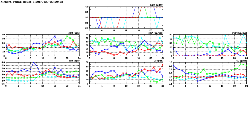 | Air Quality Data Time Series in Airport, Pump House 1 (2017/04/23) | ( Line colors: Day -3 Day -2 Day -1 Current day ) | 2D Map Current AQHI |