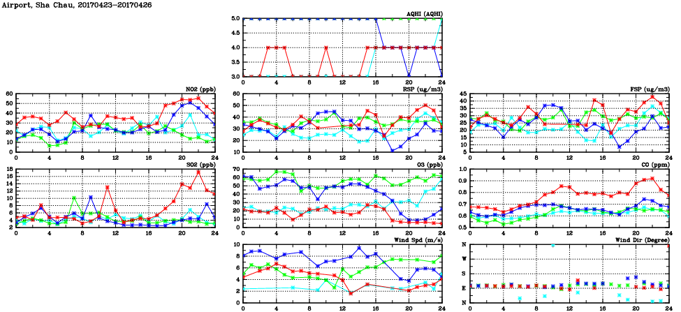 | Air Quality Data Time Series in Airport, Sha Chau (2017/04/26) | ( Line colors: Day -3 Day -2 Day -1 Current day ) | 2D Map Current AQHI |