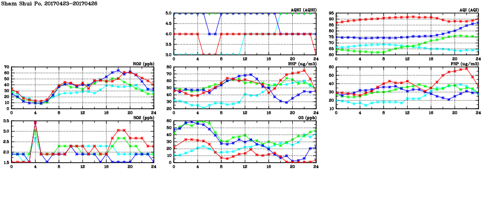 | Air Quality Data Time Series in Sham Shui Po (2017/04/26) | ( Line colors: Day -3 Day -2 Day -1 Current day ) | 2D Map Current AQHI |