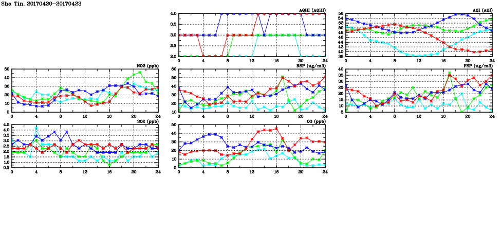 | Air Quality Data Time Series in Sha Tin (2017/04/23) | ( Line colors: Day -3 Day -2 Day -1 Current day ) | 2D Map Current AQHI |