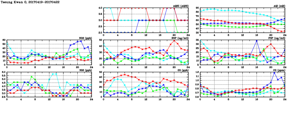 | Air Quality Data Time Series in Tseung Kwan O (2017/04/22) | ( Line colors: Day -3 Day -2 Day -1 Current day ) | 2D Map Current AQHI |