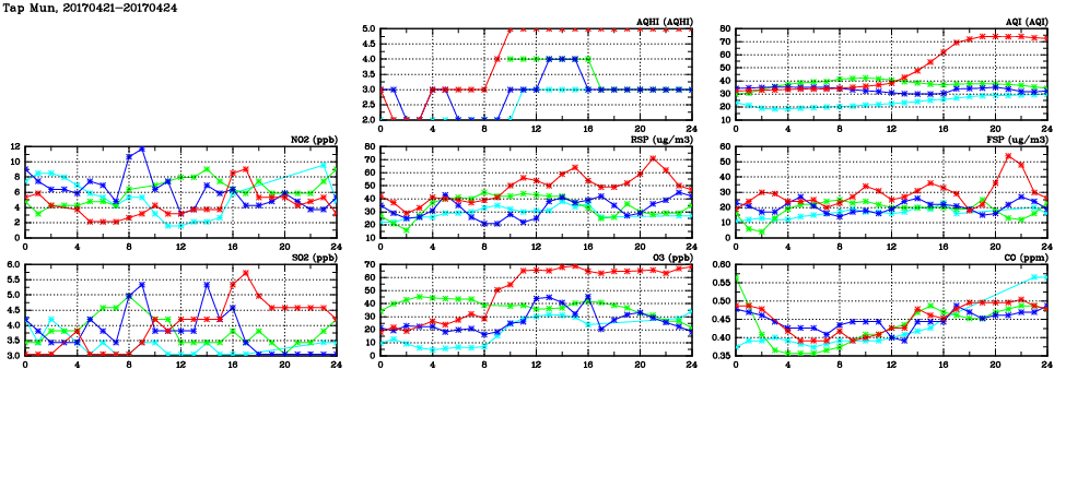 | Air Quality Data Time Series in Tap Mun (2017/04/24) | ( Line colors: Day -3 Day -2 Day -1 Current day ) | 2D Map Current AQHI |
