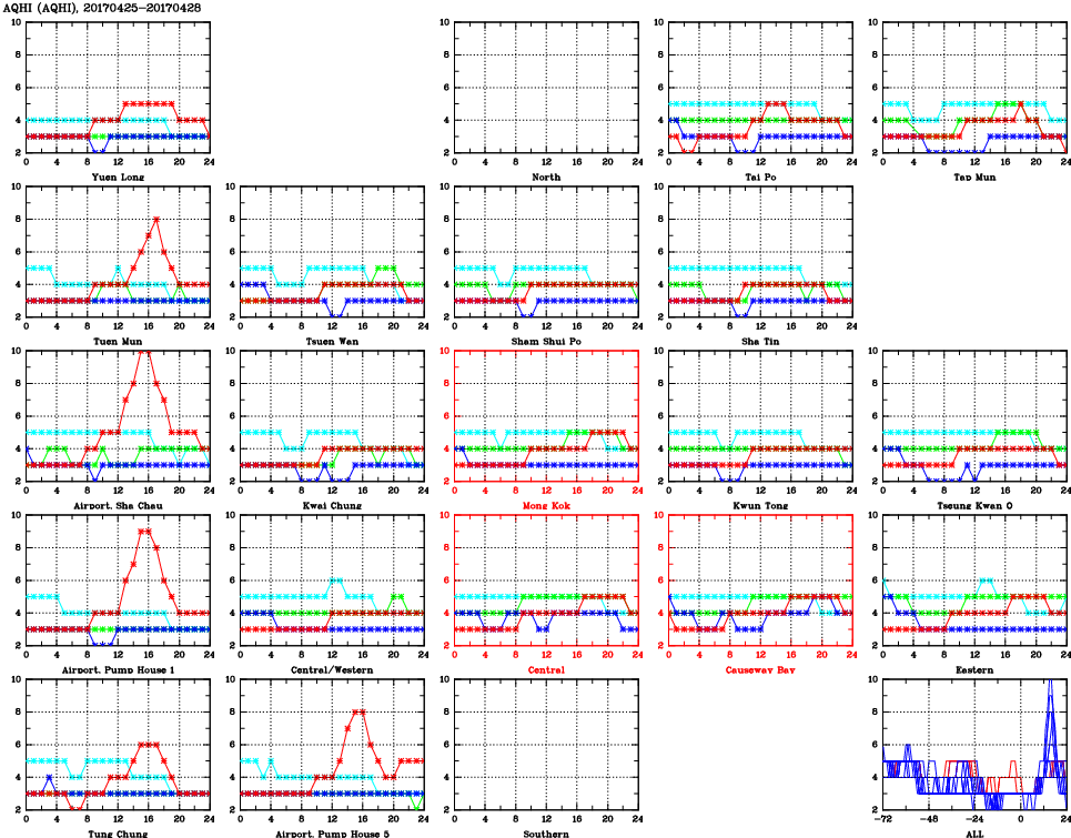 | Air Quality Data Time Series for AQHI (2017/04/28) | ( Line colors: Day -3 Day -2 Day -1 Current day ) | 2D Map Current AQHI |