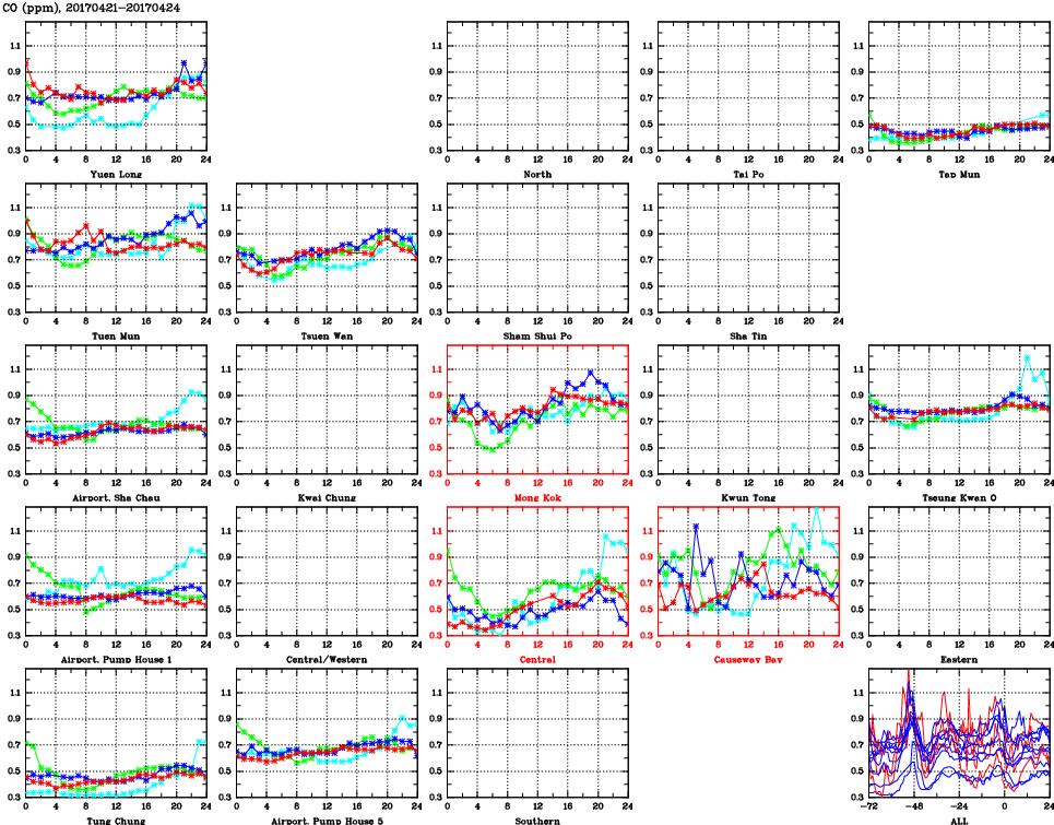| Air Quality Data Time Series for CO (2017/04/24) | ( Line colors: Day -3 Day -2 Day -1 Current day ) | 2D Map Current AQHI |