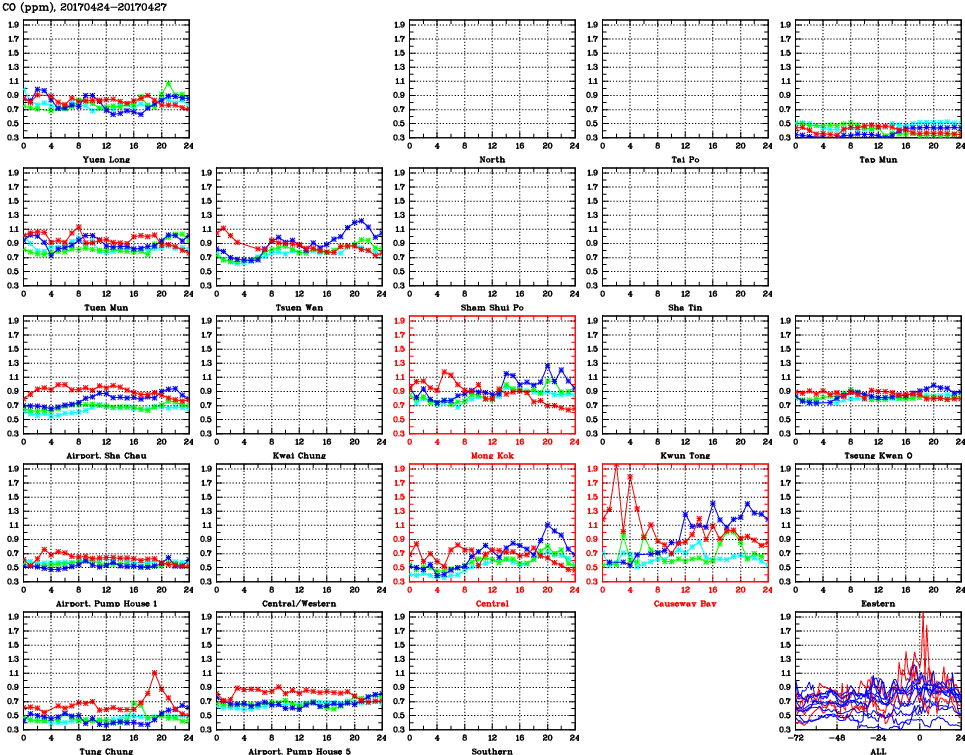 | Air Quality Data Time Series for CO (2017/04/27) | ( Line colors: Day -3 Day -2 Day -1 Current day ) | 2D Map Current AQHI |