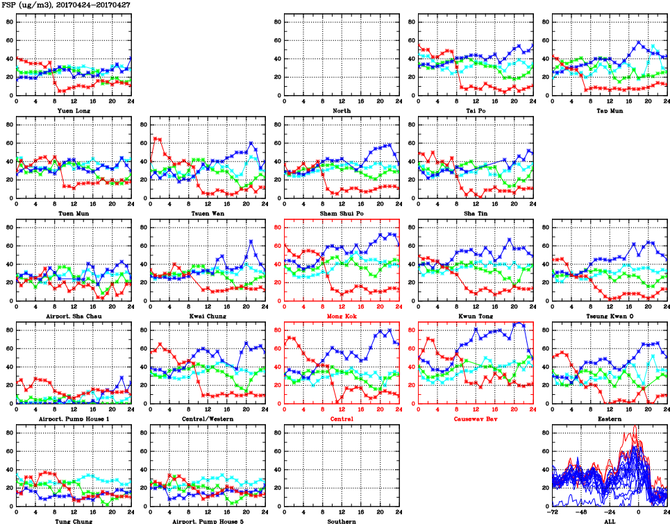 | Air Quality Data Time Series for FSP (2017/04/27) | ( Line colors: Day -3 Day -2 Day -1 Current day ) | 2D Map Current AQHI |