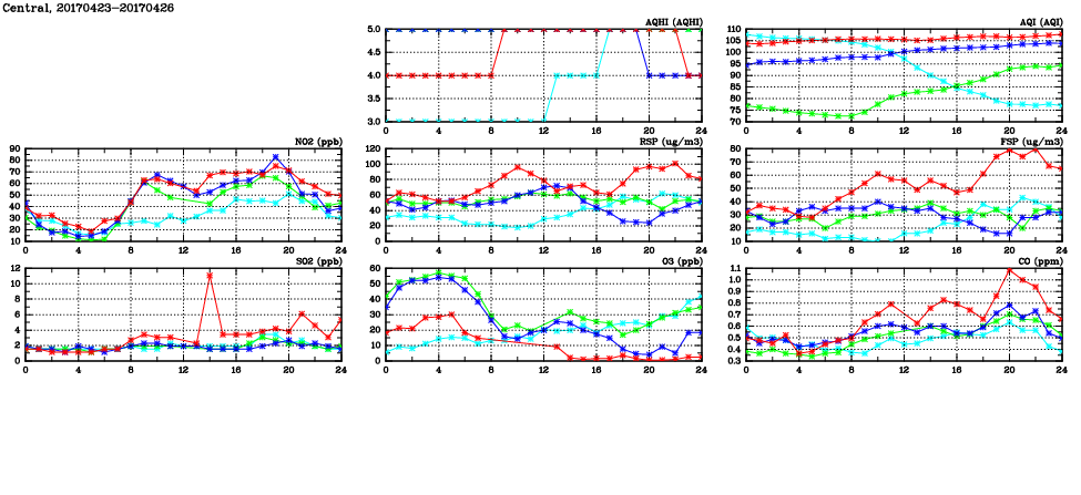 | Air Quality Data Time Series in Central (2017/04/26) | ( Line colors: Day -3 Day -2 Day -1 Current day ) | 2D Map Current AQHI |
