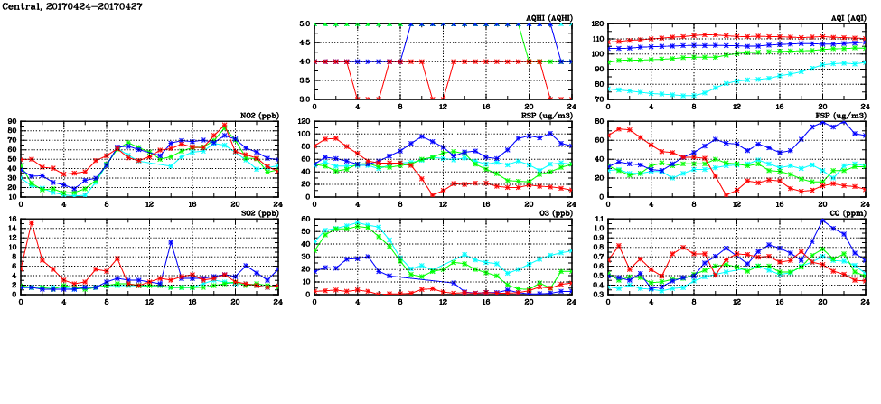 | Air Quality Data Time Series in Central (2017/04/27) | ( Line colors: Day -3 Day -2 Day -1 Current day ) | 2D Map Current AQHI |
