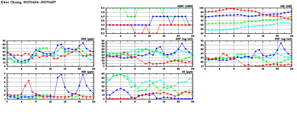 | Air Quality Data Time Series in Kwai Chung (2017/04/27) | ( Line colors: Day -3 Day -2 Day -1 Current day ) | 2D Map Current AQHI |