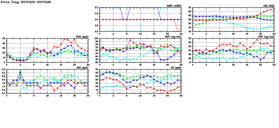 | Air Quality Data Time Series in Kwun Tong (2017/04/26) | ( Line colors: Day -3 Day -2 Day -1 Current day ) | 2D Map Current AQHI |