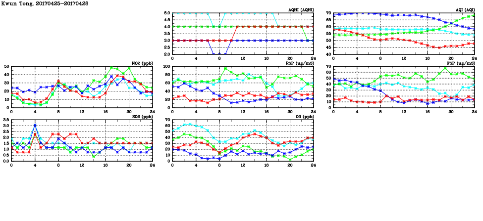 | Air Quality Data Time Series in Kwun Tong (2017/04/28) | ( Line colors: Day -3 Day -2 Day -1 Current day ) | 2D Map Current AQHI |
