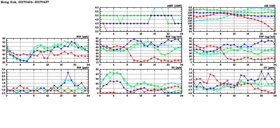 | Air Quality Data Time Series in Mong Kok (2017/04/27) | ( Line colors: Day -3 Day -2 Day -1 Current day ) | 2D Map Current AQHI |