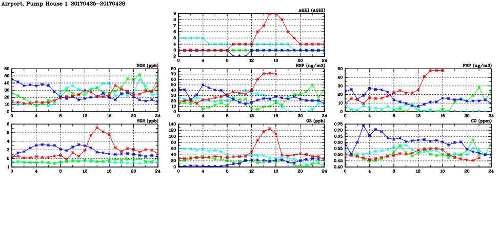 | Air Quality Data Time Series in Airport, Pump House 1 (2017/04/28) | ( Line colors: Day -3 Day -2 Day -1 Current day ) | 2D Map Current AQHI |