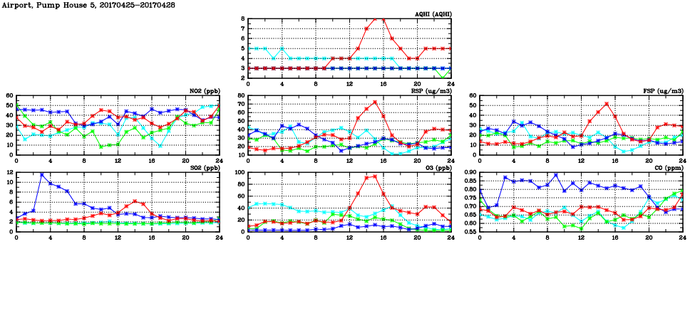 | Air Quality Data Time Series in Airport, Pump House 5 (2017/04/28) | ( Line colors: Day -3 Day -2 Day -1 Current day ) | 2D Map Current AQHI |
