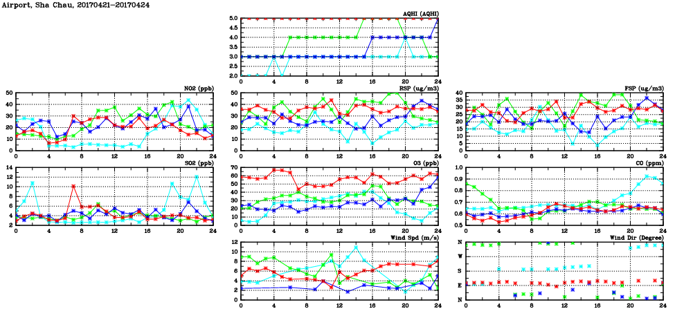 | Air Quality Data Time Series in Airport, Sha Chau (2017/04/24) | ( Line colors: Day -3 Day -2 Day -1 Current day ) | 2D Map Current AQHI |