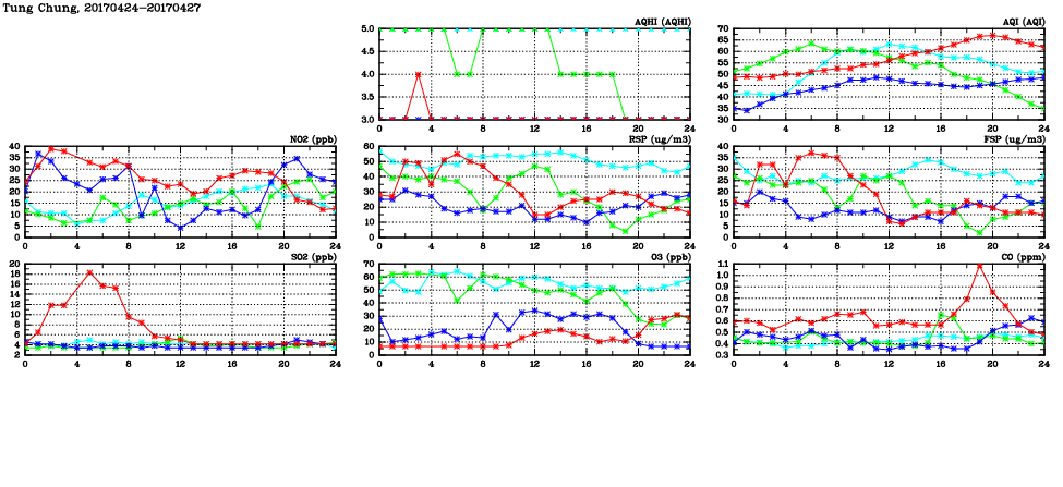 | Air Quality Data Time Series in Tung Chung (2017/04/27) | ( Line colors: Day -3 Day -2 Day -1 Current day ) | 2D Map Current AQHI |