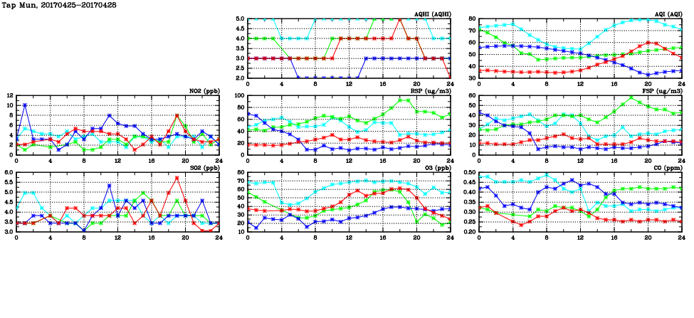 | Air Quality Data Time Series in Tap Mun (2017/04/28) | ( Line colors: Day -3 Day -2 Day -1 Current day ) | 2D Map Current AQHI |