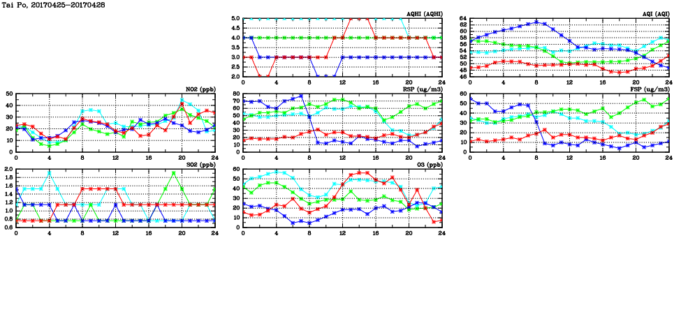 | Air Quality Data Time Series in Tai Po (2017/04/28) | ( Line colors: Day -3 Day -2 Day -1 Current day ) | 2D Map Current AQHI |