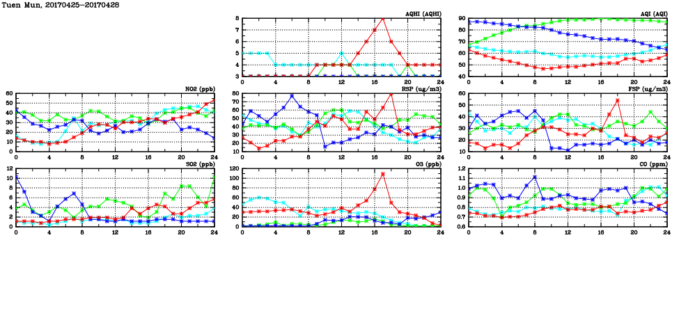 | Air Quality Data Time Series in Tuen Mun (2017/04/28) | ( Line colors: Day -3 Day -2 Day -1 Current day ) | 2D Map Current AQHI |
