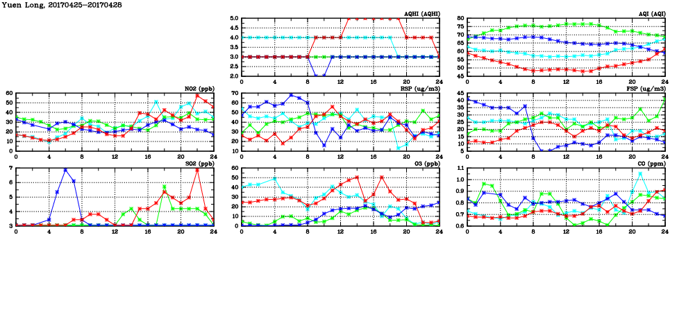 | Air Quality Data Time Series in Yuen Long (2017/04/28) | ( Line colors: Day -3 Day -2 Day -1 Current day ) | 2D Map Current AQHI |