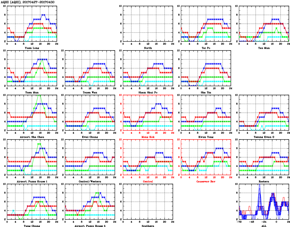 | Air Quality Data Time Series for AQHI (2017/04/30) | ( Line colors: Day -3 Day -2 Day -1 Current day ) | 2D Map Current AQHI |
