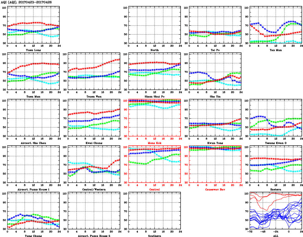 | Air Quality Data Time Series for AQI (2017/04/26) | ( Line colors: Day -3 Day -2 Day -1 Current day ) | 2D Map Current AQHI |