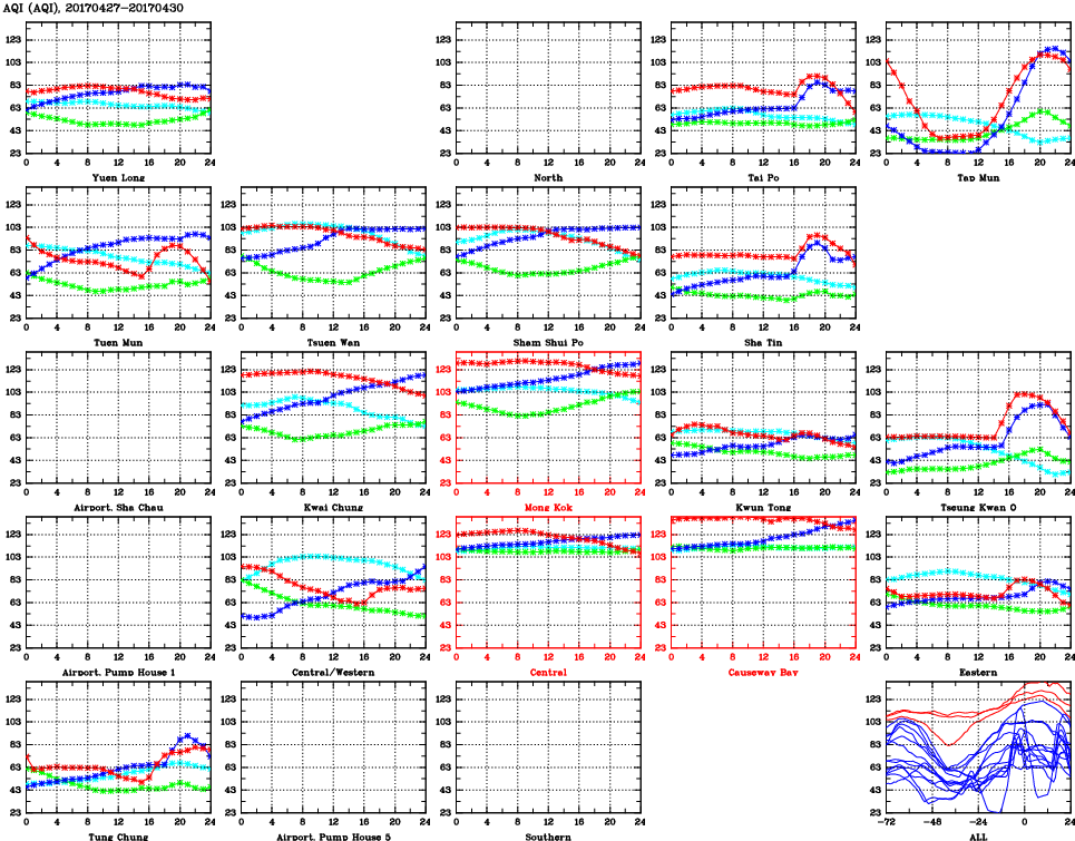 | Air Quality Data Time Series for AQI (2017/04/30) | ( Line colors: Day -3 Day -2 Day -1 Current day ) | 2D Map Current AQHI |